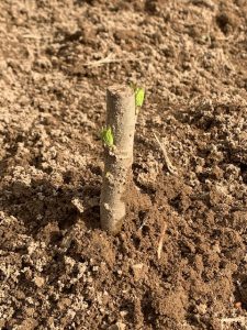 写真は植え付けたばかりの桑の苗木、(この苗木1本から3年かけて育てます)